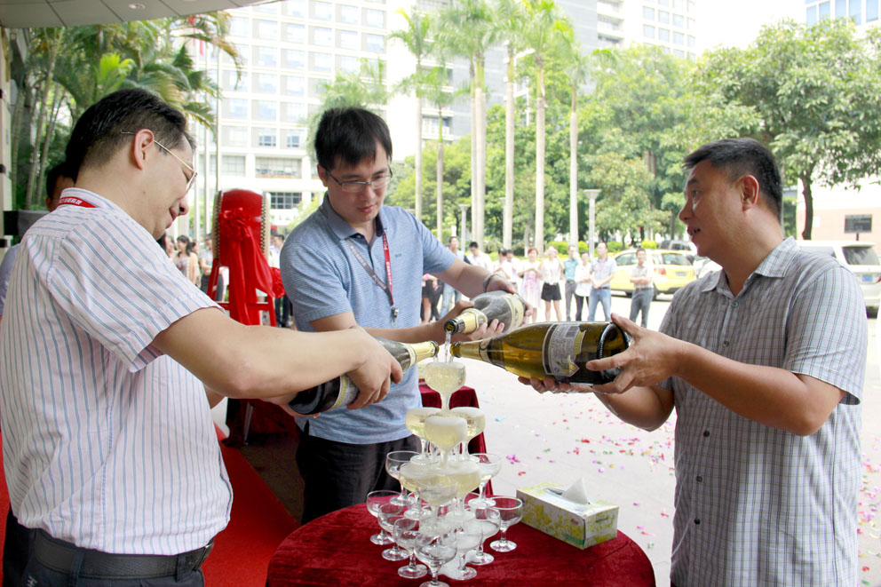 在慶功典禮上,董事長劉偉,副總裁顧友良,助理總裁、智能安防(廣東)事業部總經理劉斌共同開啟香檳慶祝